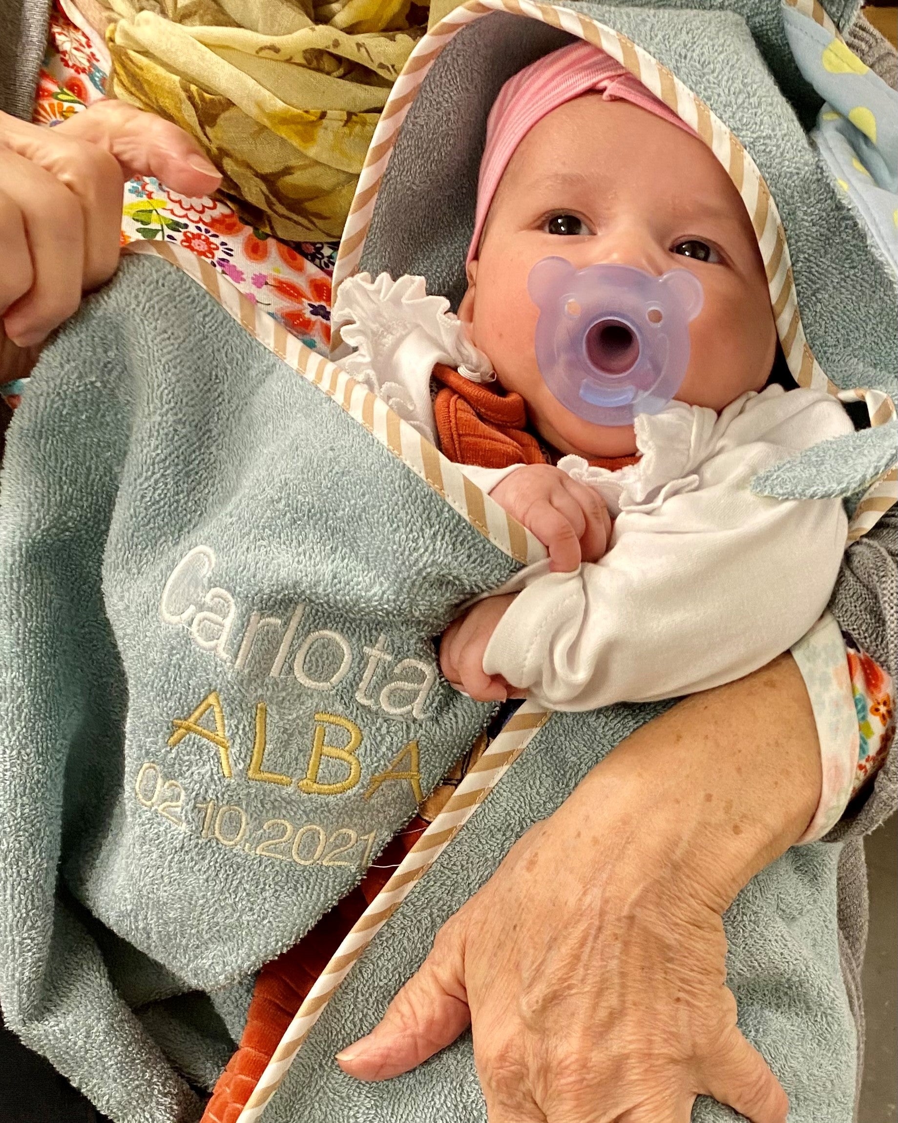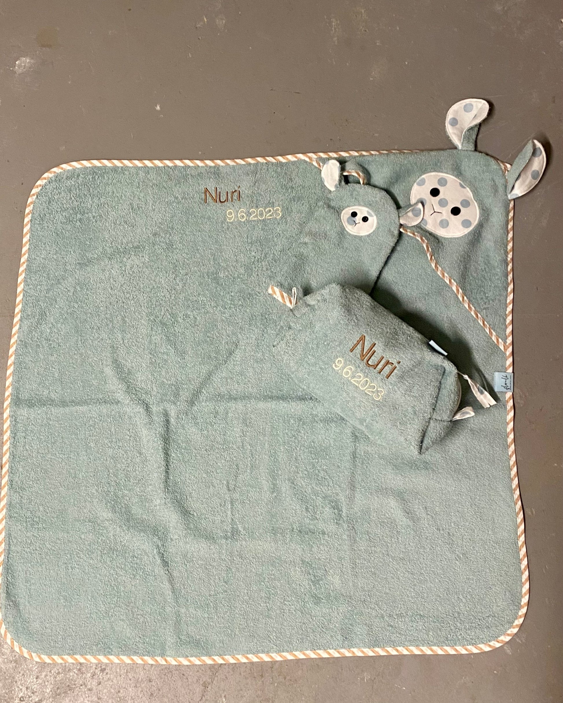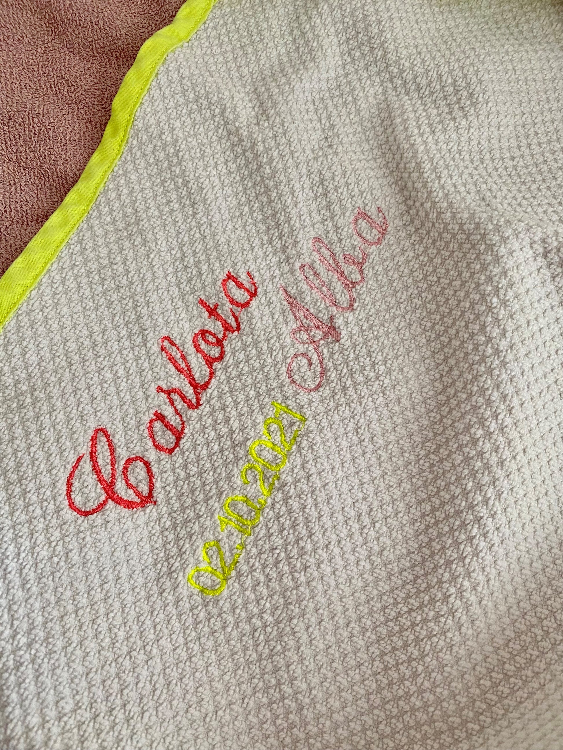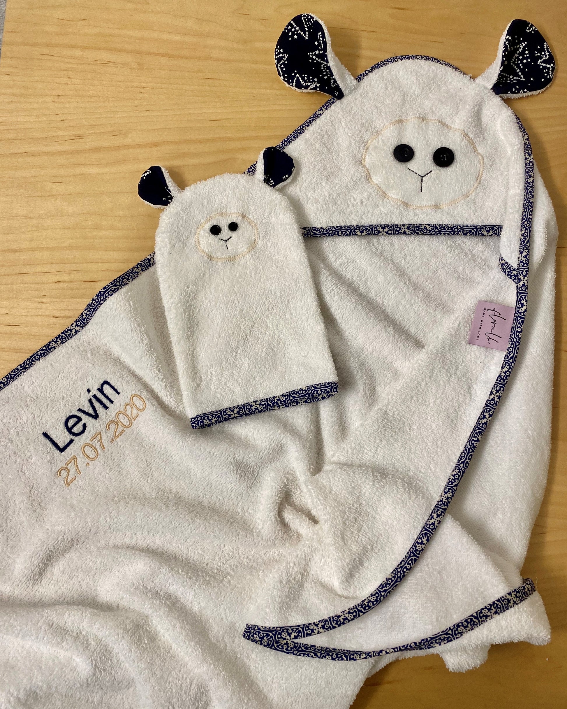 Dieses Kapuzen-Badetuch ist aus feinstem Bio-Baumwoll-Frottee mit GOTS-Zertifizierung. Ausserdem kannst du es personalisieren lassen mit dem Namen, einem anderen Wort und/oder dem Geburtsdatum des Kindes.